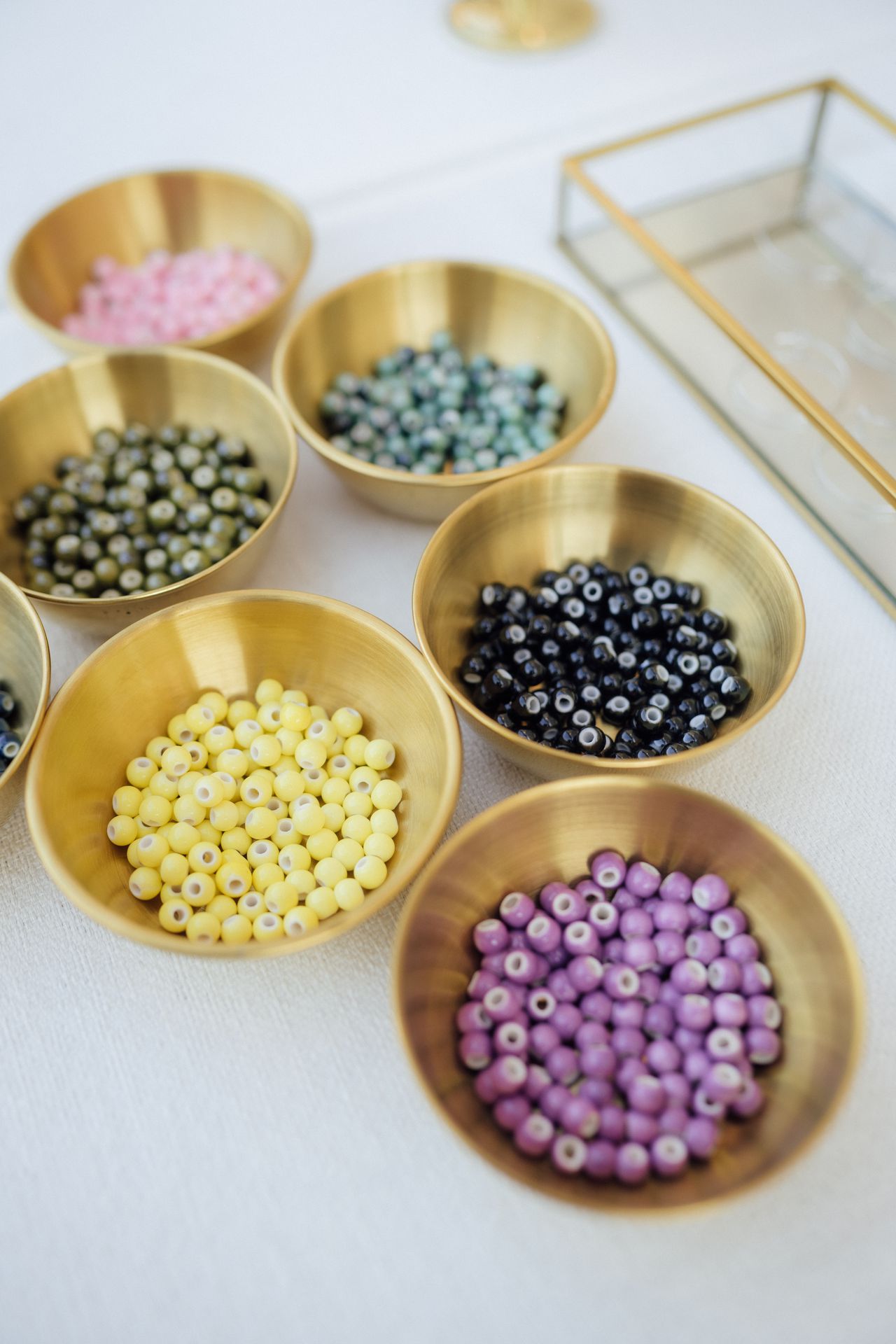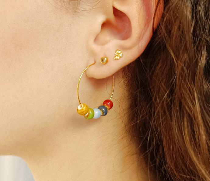 Tus invitadas podrán hacerse ellas mismas la combinación de pendientes que quieran. Compuesto por aro de acero inoxidable anti alérgico de diferentes tamaños y cuentas de cerámica de diferentes colores.